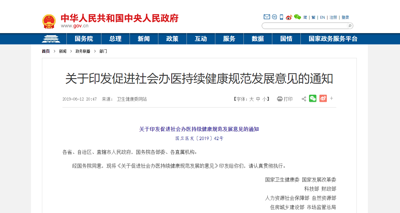 2019年6月,国家卫生健康委发布《促进社会办医持续健康规范发展意见的通知》(以下简称《通知》)。鼓励社会办医疗机构发展建设智慧医疗。