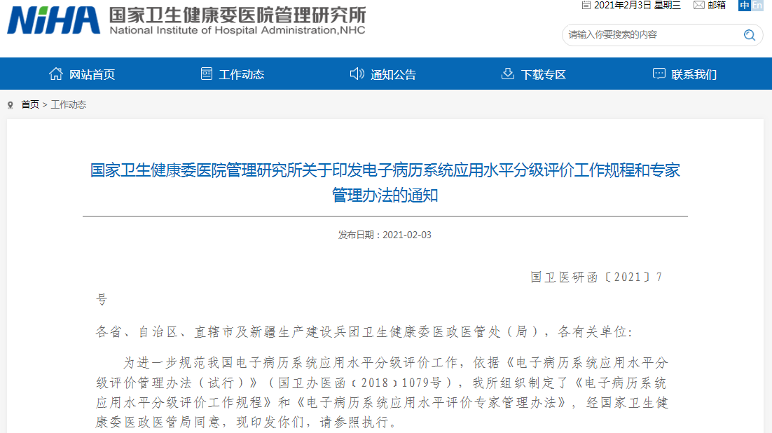 2021年2月3日,国家卫生健康委医院管理研究所发布了《国家卫生健康委医院管理研究所关于印发电子病历系统应用水平分级评价工作规程和专家管理办法的通知》(以下简称《通知》),加速推进智慧医疗落地进程。