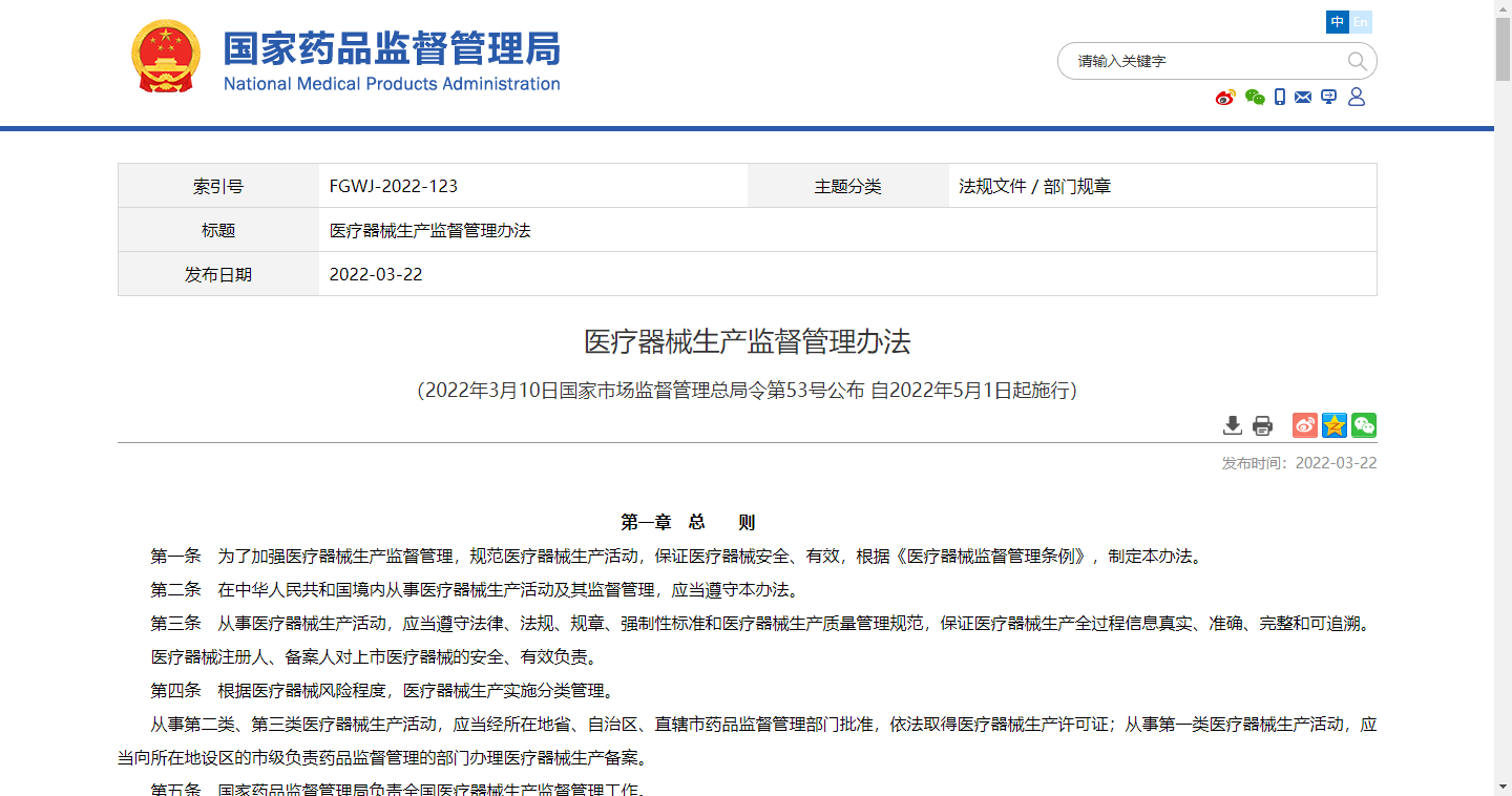 近日,市场监管总局发布了修订后的《医疗器械生产监督管理办法》和《医疗器械经营监督管理办法》,自2022年5月1日起施行。重点加强智慧医疗精细化管理医疗器械能力。
