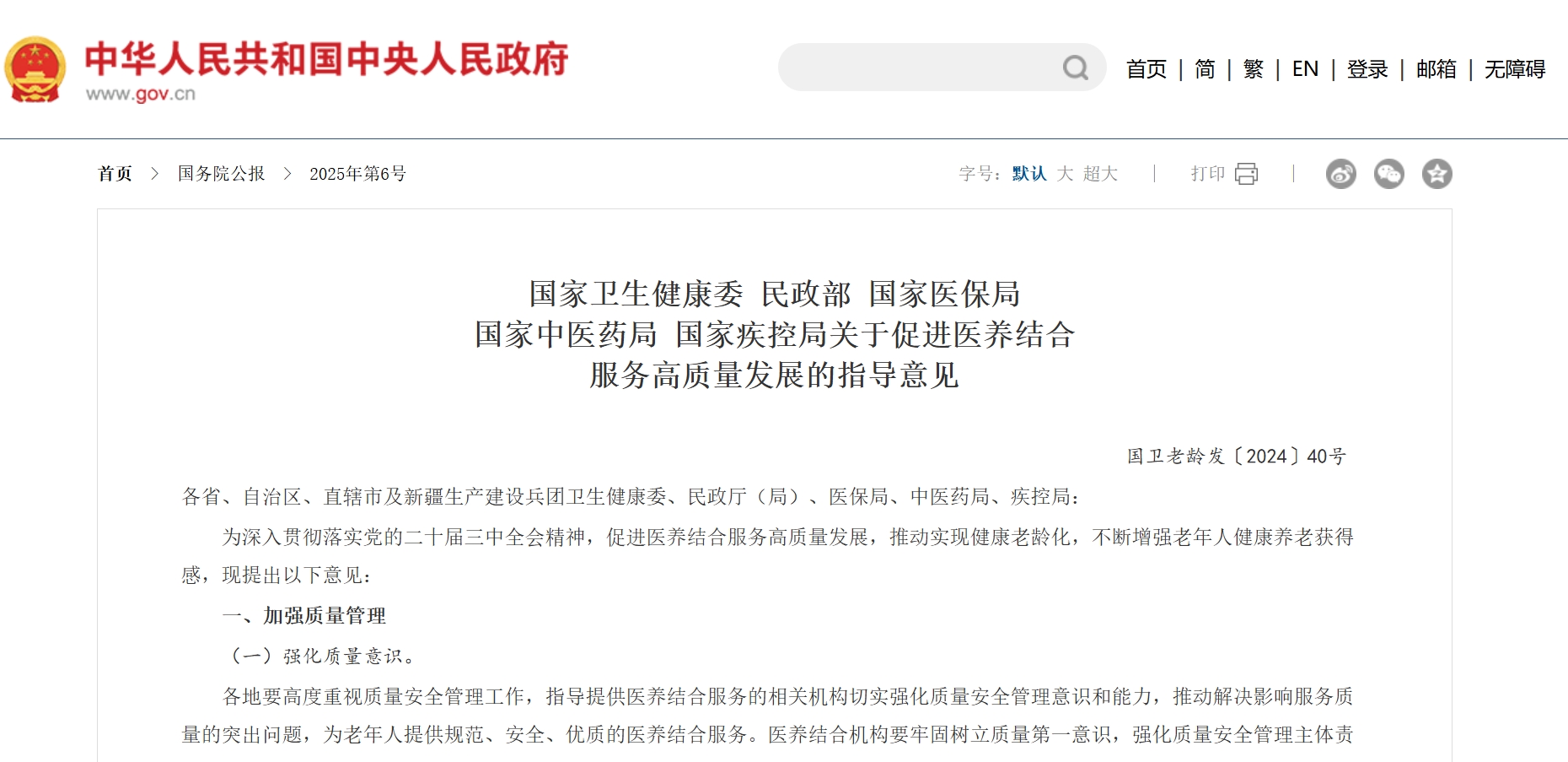 随着我国老龄化进程的加速,如何让老年人安享幸福晚年,成为全社会关注的焦点。在此背景下,国家卫生健康委、民政部、国家医保局、国家中医药局、国家疾控局联合印发的《关于促进医养结合服务高质量发展的指导意见》,犹如一场及时雨,为推动医养结合服务的高质量发展,实现健康老龄化,提供了有力的政策支撑。