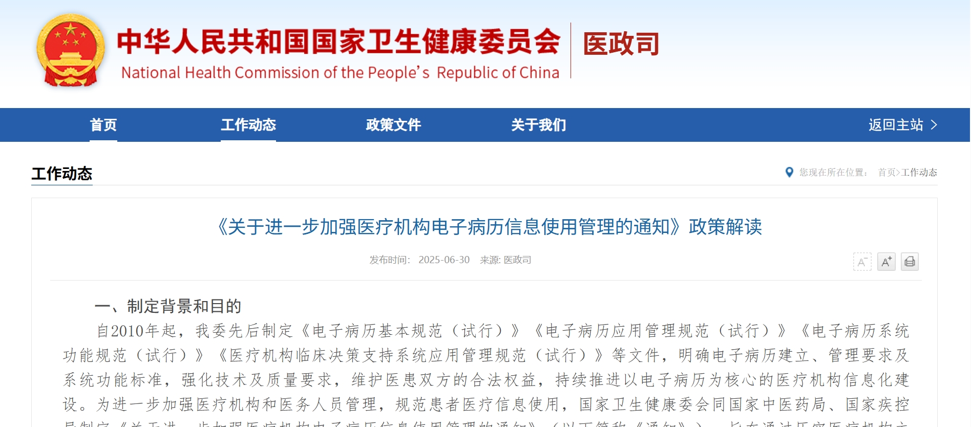 在医疗信息化高速发展的今天,电子病历早已成为医疗机构日常诊疗工作的重要组成部分。然而,随着数据泄露事件频发,电子病历的安全管理迫在眉睫。6月30日,国家卫生健康委、国家中医药局、国家疾控局三部门联合发布《关于进一步加强医疗机构子病历信息使用管理的通知》(以下简称《通知》),对电子病历的规范管理、权限控制、数据安全等提出更严格要求。这是继2017年《电子病历应用管理规范(行)》后,我国医疗信息化领域的又一里程碑式政策。以下是新规的六大核心要点,医疗机构和医务人员必看!