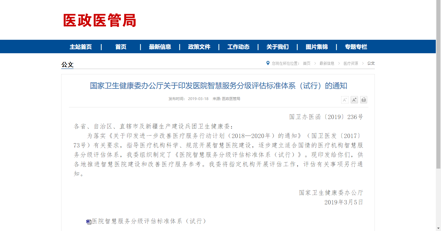 为落实《关于印发进一步改善医疗服务行动计划(2018—2020年)的通知》有关要求,指导医疗机构科学、规范开展智慧医院建设,逐步建立适合国情的医疗机构智慧服务分级评估体系,我委组织制定了《医院智慧服务分级评估标准体系(试行)》。