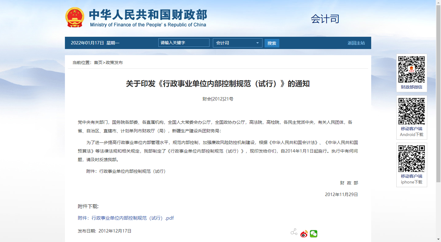 为了进一步提高行政事业单位内部管理水平,规范内部控制,加强廉政风险防控机制建设,根据《中华人民共和国会计法》、《中华人民共和国预算法》等法律法规和相关规定,财政部制定了《行政事业单位内部控制规范(试行)》