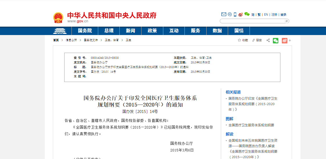 2015年3月6日,国务院办公厅印发《全国医疗卫生服务体系规划纲要(2015—2020年)》(以下简称《规划纲要》)。《规划纲要》强调,推动社会办医是满足人民群众多元化医疗卫生服务需求的重大举措,并对我国医疗卫生资源做出详细调整和布局,支持并推进社会办医朝智慧医疗发展。