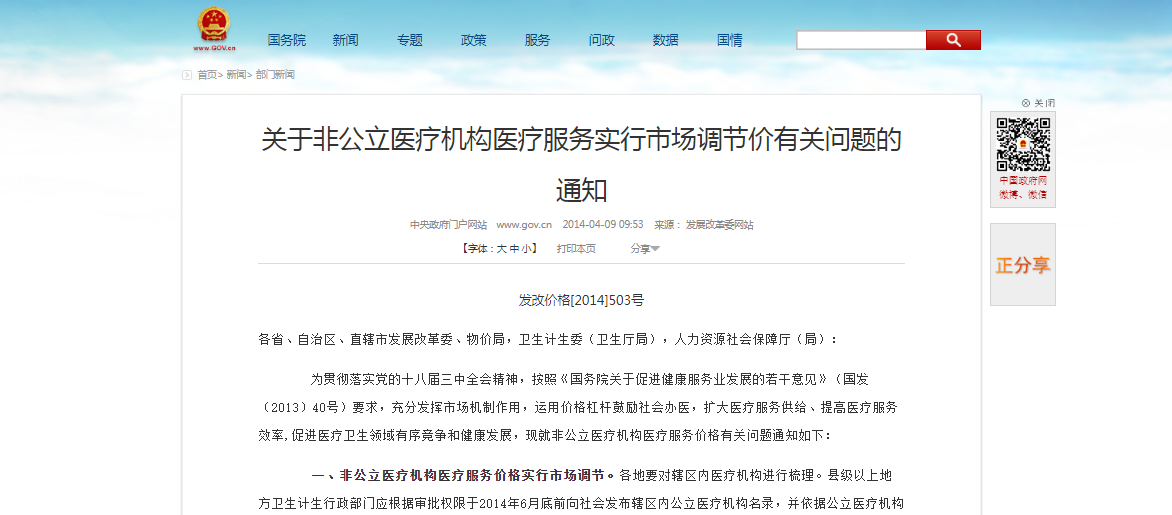 2014年3月25日,国家发展改革委发布《关于非公立医疗机构医疗服务实行市场调节价有关问题的通知》(以下简称《通知》)。《通知》强调,为扩大医疗服务供给、提高智慧医疗服务效率,促进医疗卫生领域有序竞争和健康发展,现就非公立医疗机构医疗服务价格公布了有关问题通知。