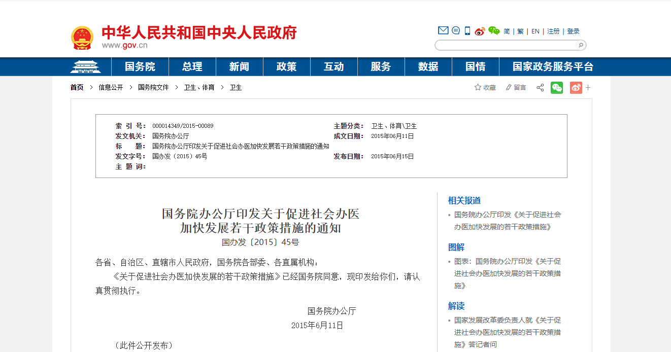 2015年6月11日,国务院办公厅印发《关于促进社会办医加快发展若干政策措施的通知》(以下简称《措施》)。《措施》提出,新一轮医改实施以来,国家出台多项措施促进社会办医发展,政策效应持续显现。借助智慧医疗等信息化手段加快推进社会办医疗机构成规模、上水平发展,不仅能够不断满足人民群众多样化、多层次医疗卫生服务需求,也可以为经济社会转型发展注入新的动力。