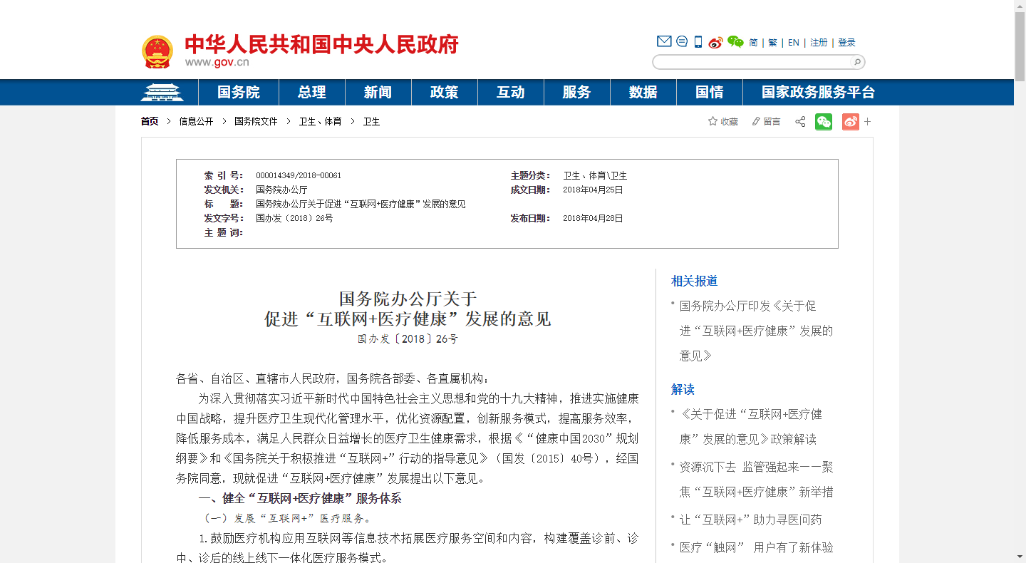 根据《“健康中国2030”规划纲要》和《国务院关于积极推进“互联网+”行动的指导意见》,现就促进“互联网+医疗健康”发展提出以下意见。