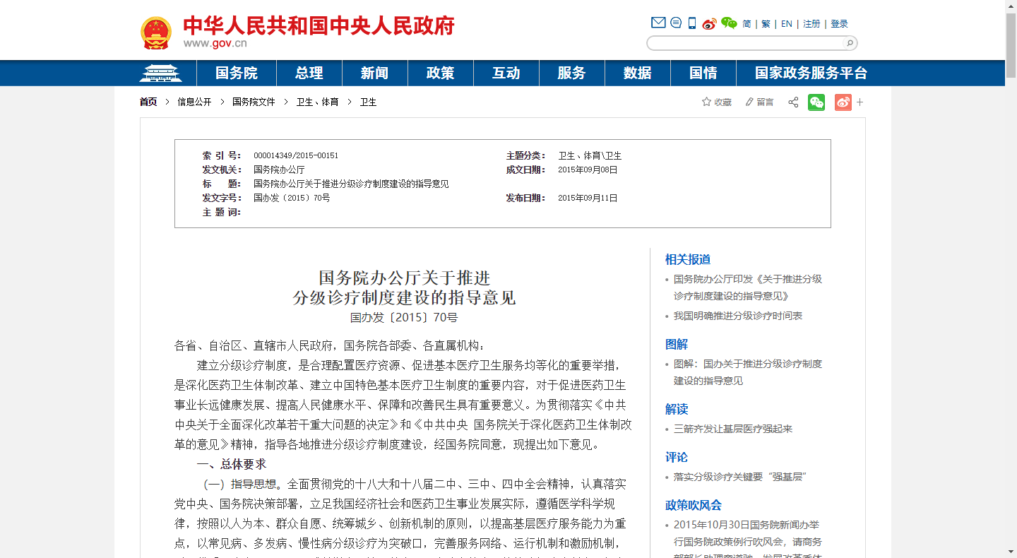 建立分级诊疗制度,是合理配置医疗资源、促进基本医疗卫生服务均等化的重要举措,是深化医药卫生体制改革、建立中国特色基本医疗卫生制度的重要内容,对于促进医药卫生事业长远健康发展、提高人民健康水平、保障和改善民生具有重要意义。