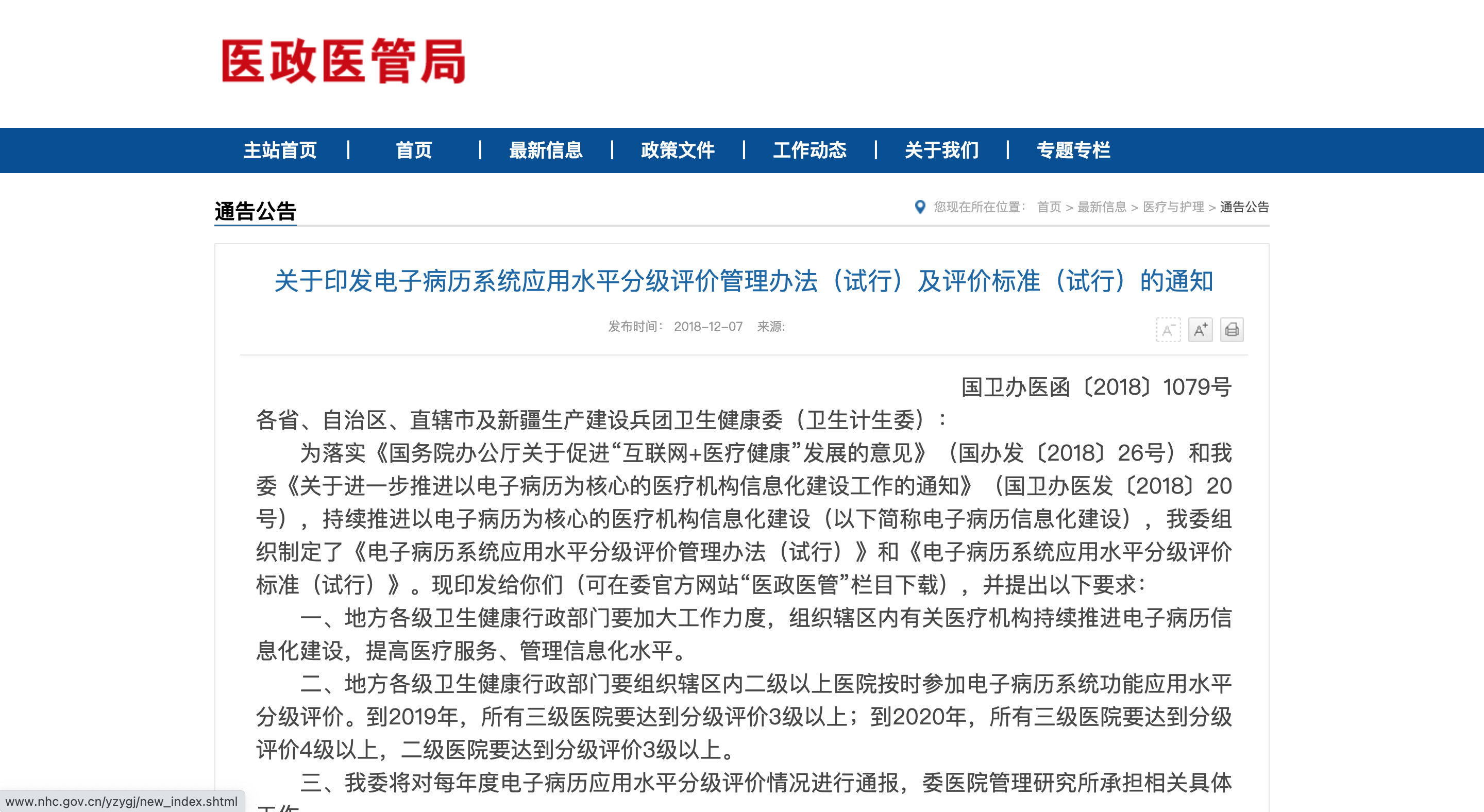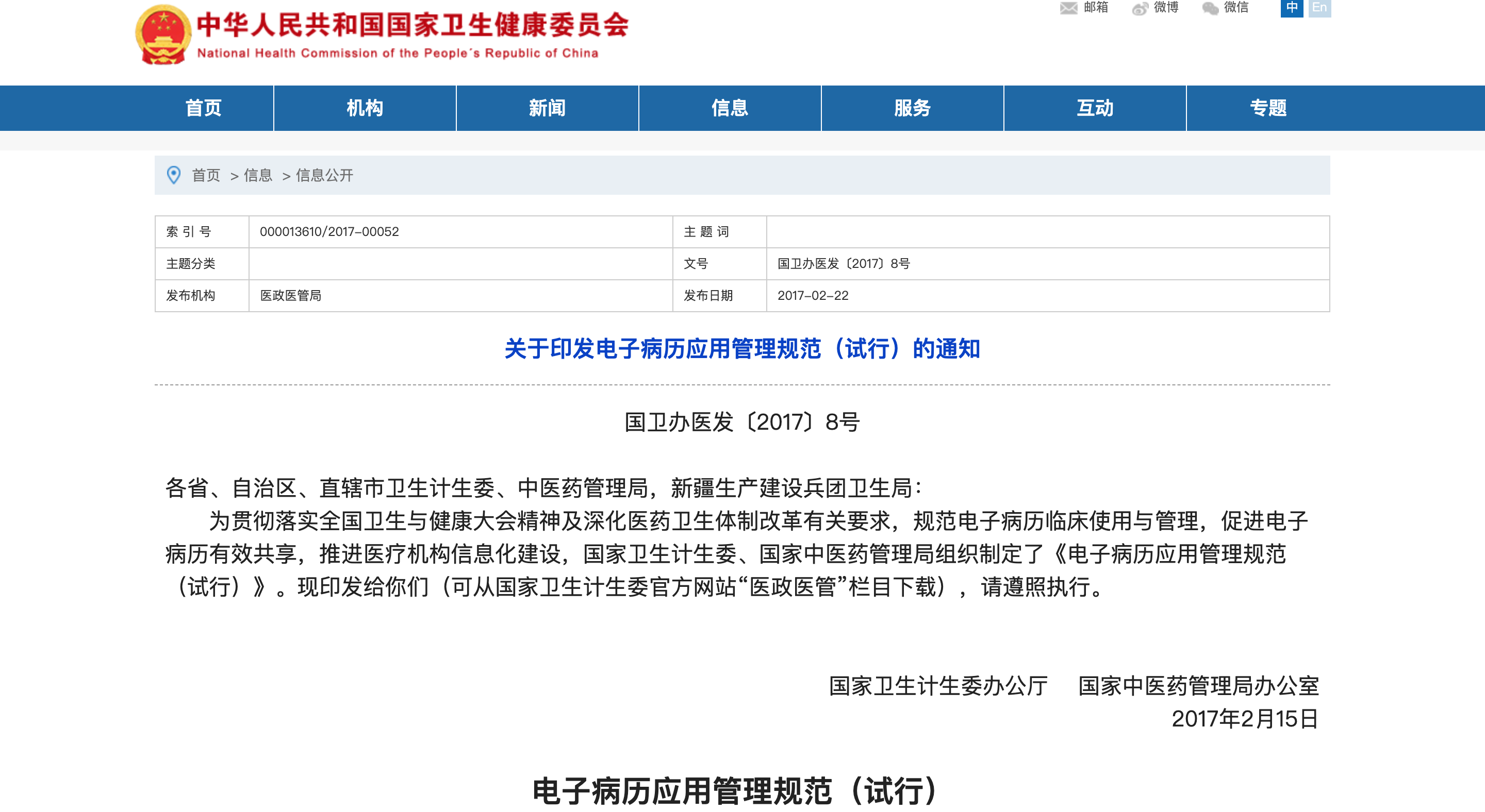 为贯彻落实全国卫生与健康大会精神及深化医药卫生体制改革有关要求,规范电子病历临床使用与管理,促进电子病历有效共享,推进医疗机构信息化建设,国家卫生计生委、国家中医药管理局组织制定了《电子病历应用管理规范(试行)》。