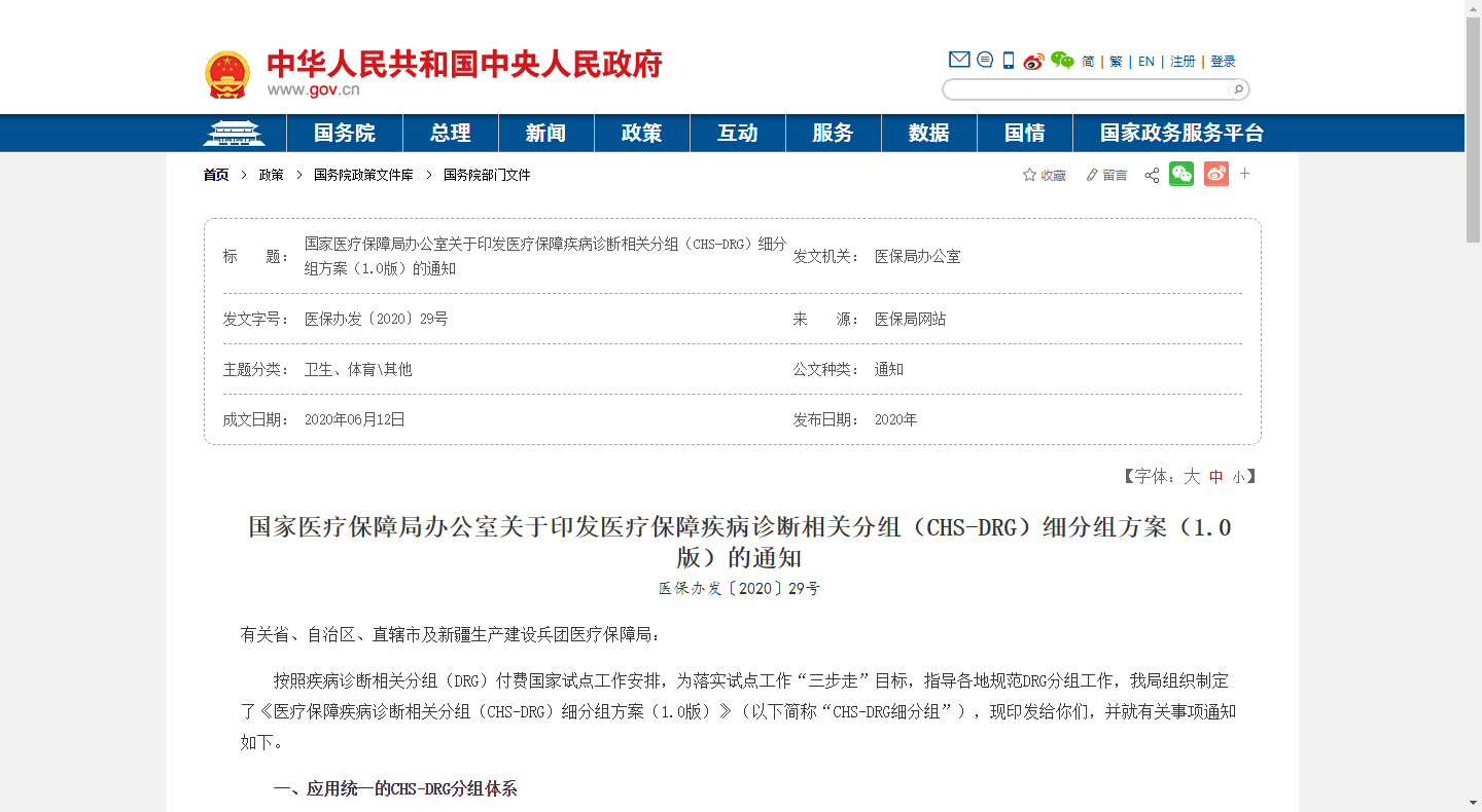 国家医疗保障局办公室制定了《医疗保障疾病诊断相关分组(CHS-DRG)细分组方案(1.0版)