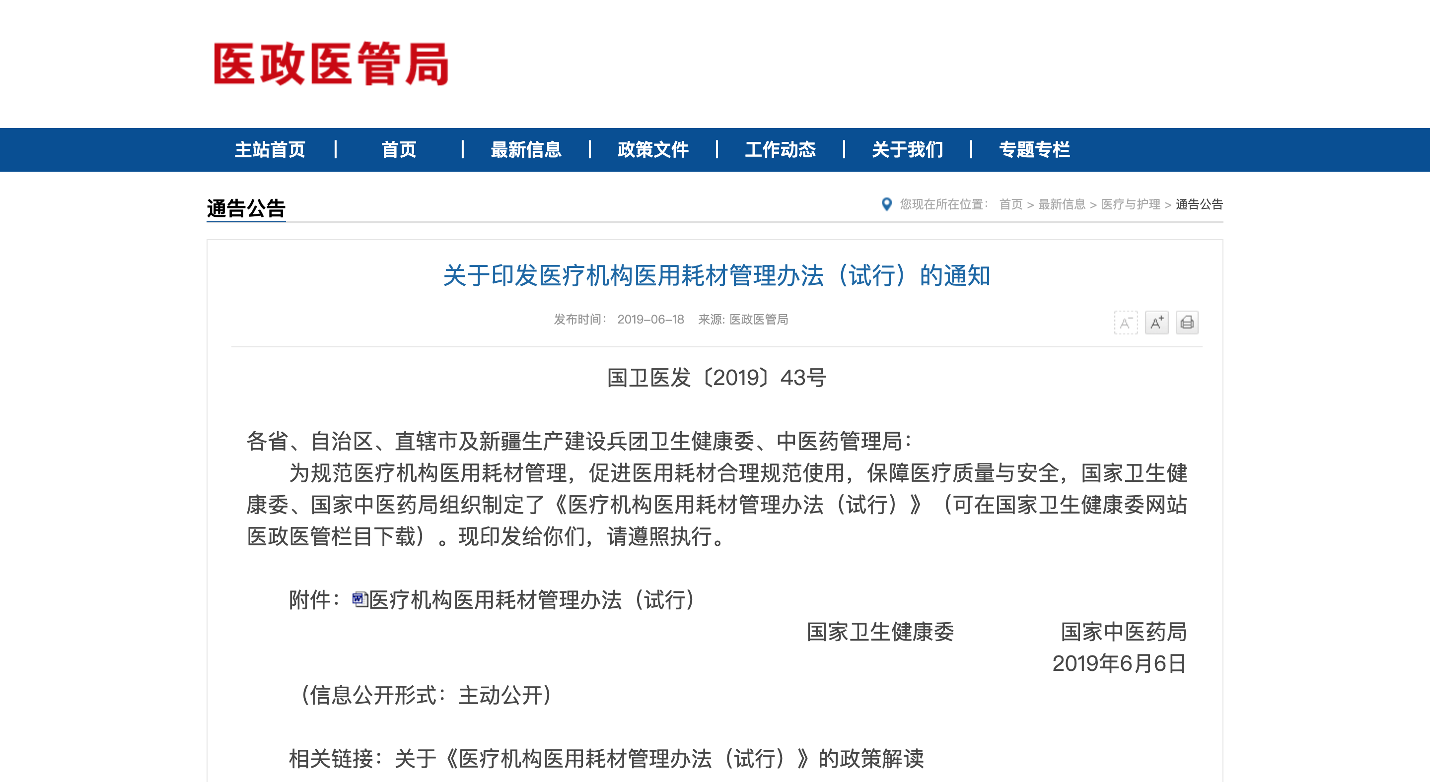 为规范医疗机构医用耗材管理,促进医用耗材合理规范使用,保障医疗质量与安全,国家卫生健康委、国家中医药局组织制定了《医疗机构医用耗材管理办法(试行)》