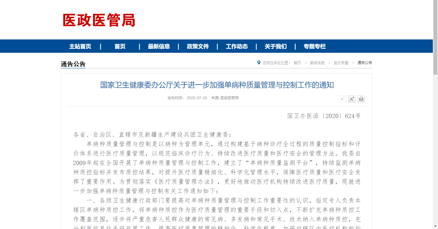 为贯彻落实《医疗质量管理办法》,更好地推动医疗机构持续改进医疗质量,现就进一步加强单病种质量管理与控制有关工作通知
