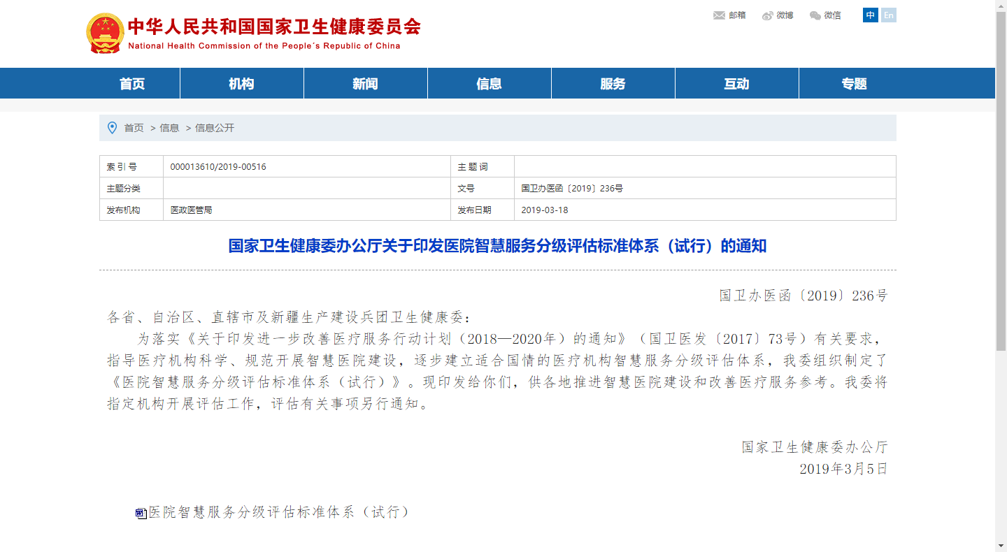 为落实《关于进一步完善预约诊疗制度加强智慧医院建设的通知》有关要求,指导医疗机构科学、规范开展智慧医院建设,提升医院管理精细化、智能化水平,国家卫健委组织制定了《医院智慧管理分级评估标准体系(试行)》