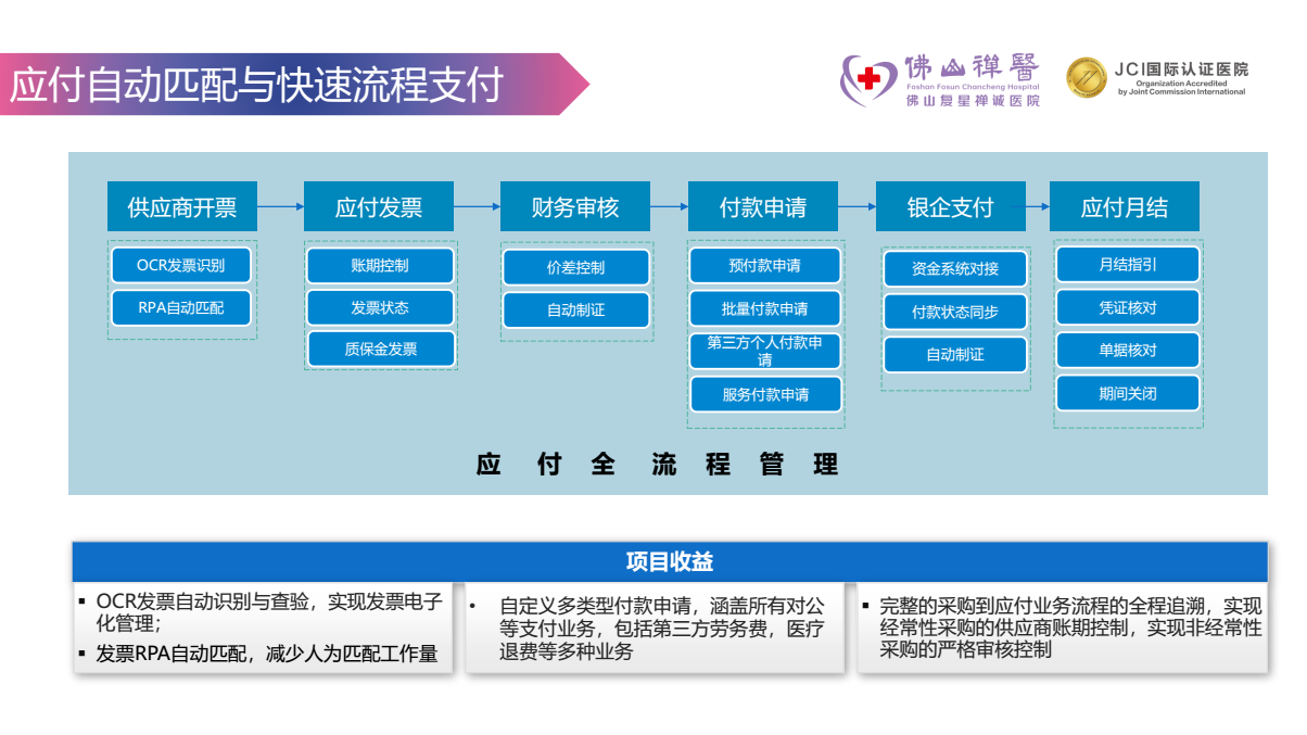 HRP支持禅医进行多业务、多流程的快速支付,从采购到应付业务全流程追溯,并运用OCR发票自动识别与查验、发票RPA自动匹配等智能应用,实现电子化、自动化高效管理,减少人工作业的差错率。