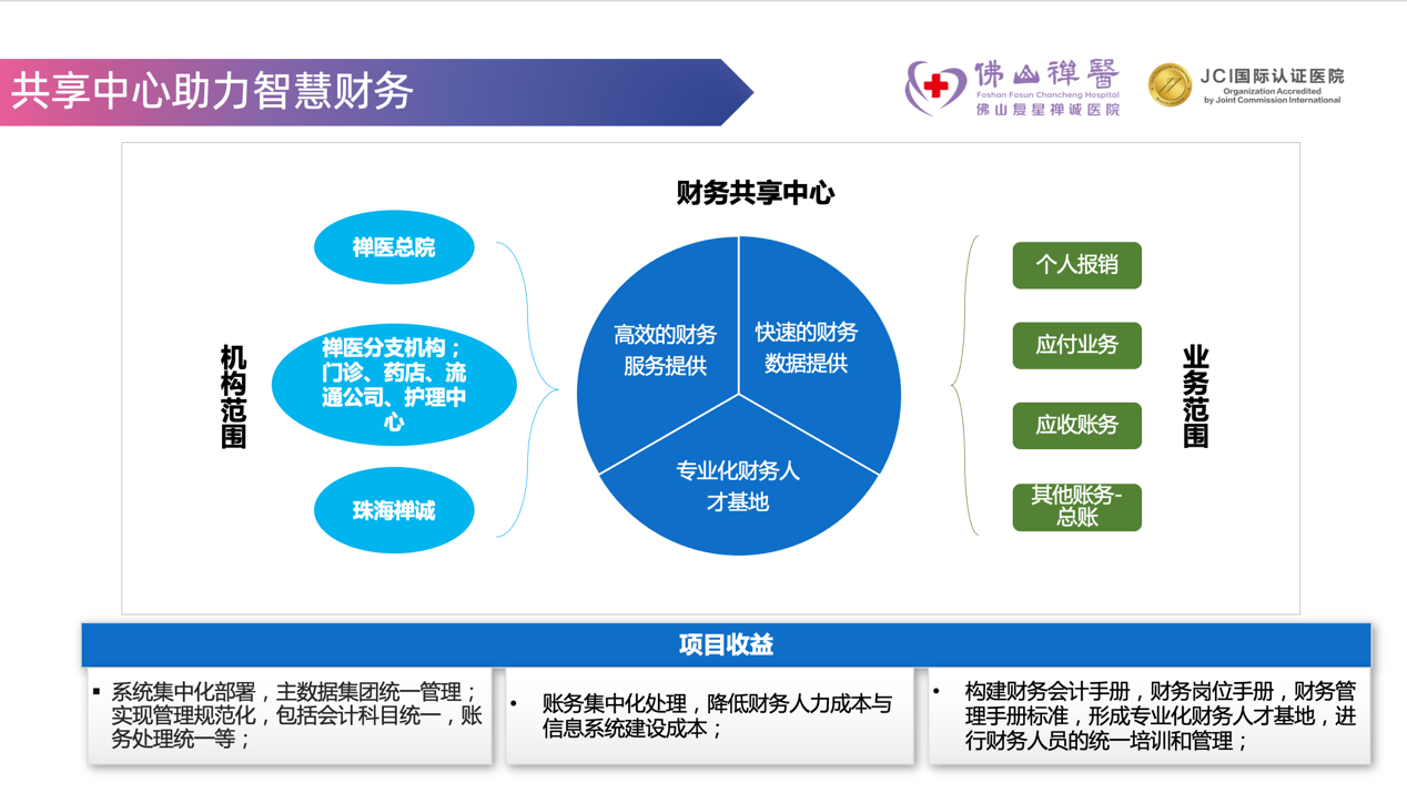 在此基础上,康博嘉HRP更为禅医搭建了财务共享中心,覆盖禅医主院、珠海禅诚医院以及分支门诊、药店、护理中心等机构;利用共享中心,禅医能根据统一的核算标准,高效、集中地处理费用报销、日常会计交易、资金支付等业务,快速地提供所需财务数据,并形成专业化、统一化的财务人才培训管理。