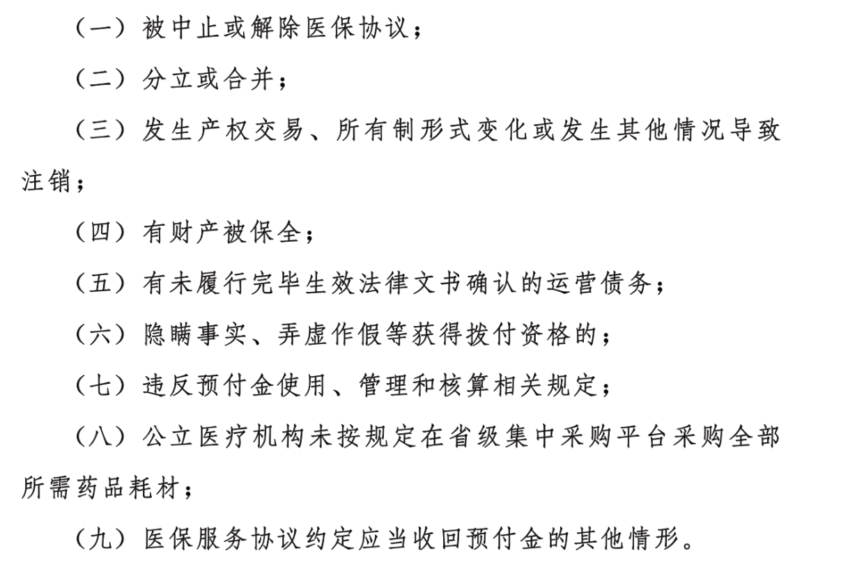 另一方面,如果在使用“预付金”的过程中,医疗机构出现下图中的任意一项情形,医保部门有权利要求收回“预付金”。