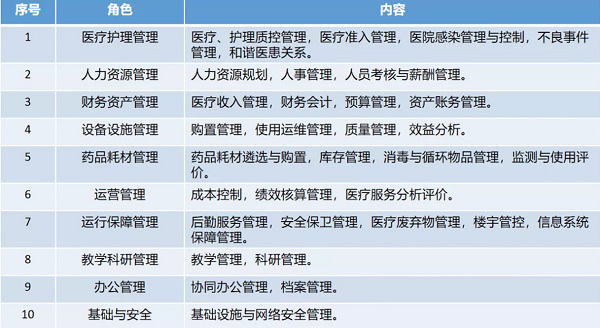 《通知》显示,该体系将医院管理业务划分为10大类角色,每一角色又细分出数项业务,共计33项。