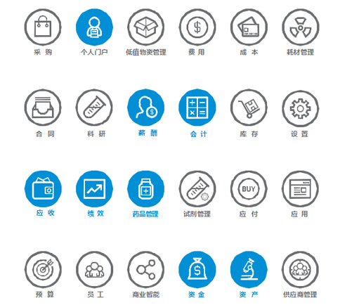 HRP系统具备完整的人财物管理体系,除了基础的个人门户、人事、薪酬、会计、应付、应收、费用、耗材、物资、药品、固定资产等功能模块,还有提升管理水平的管理模块,比如绩效、预算、项目经费、合同、SRM、BI等,可以根据用户管理的需求选择安装使用。