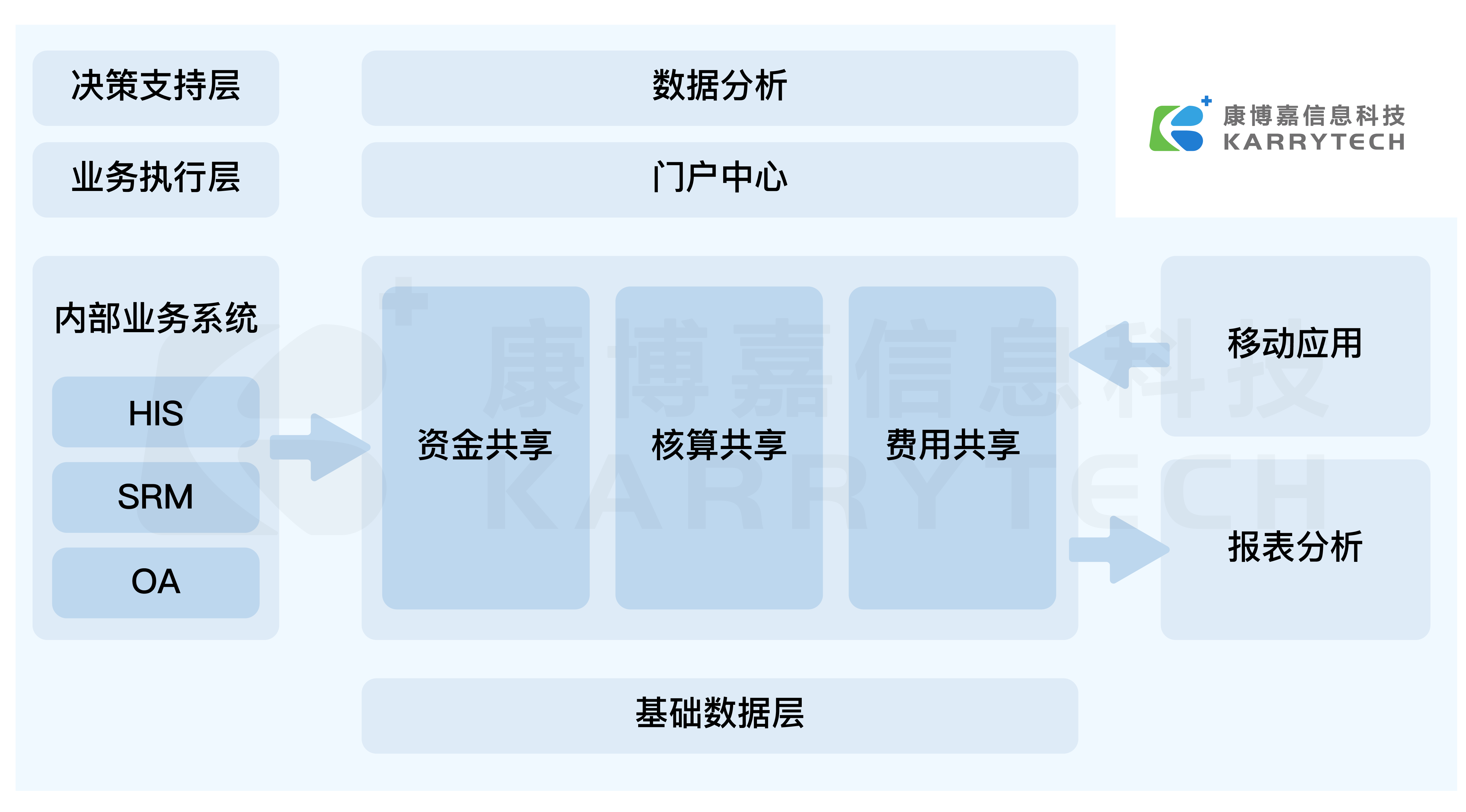 财务共享中心是集团型医疗机构健康发展的“保健品”,一个好的财务共享中心既能把分散的重复性工作集中起来,形成标准化流程,提高子机构的工作效率,又能满足集团管控、资源协同的要求。例如康博嘉HRP系统,就为复星医疗集团旗下佛山禅诚医院及哥伦比亚中国旗下医疗机构搭建了财务共享中心,助力院方统一核算标准,高效集中地处理费用报销、日常会计交易、资金支付等业务,快速提供各类财务数据,支持集团/各院区的统一管理和高速运转,也为业务继续扩张扫清了障碍。