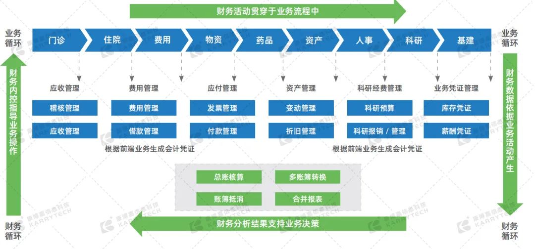康博嘉智慧管理HRP解决方案将打通财务流和业务流,通过打磨总账、应收、应付、资金管理、报销、报表等关键模块,全面支持规范化财务管理;与此同时,康博嘉HRP还将通过全面预算模块和成本模块,管理全院预算全流程并实现不同科室、医疗服务项目、病种等成本核算和分析。