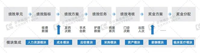 灵活定义功能适配 RBRVS、DRGs、BSC 及 KPI 等多种绩效考核方案,集合人力资源、成本、薪酬、资产及临床医疗等模块,支持从绩效单元制定至奖金分配的全流程实施。