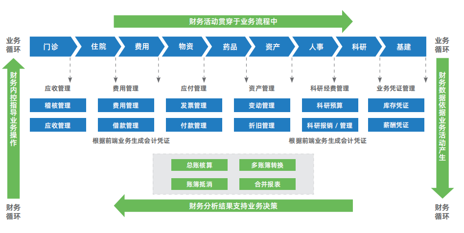 助力医院形成业务信息流与财务流合二为一的统一平台管理,让业务账可以直接生成财务账,财务账直接追溯查看业务账。