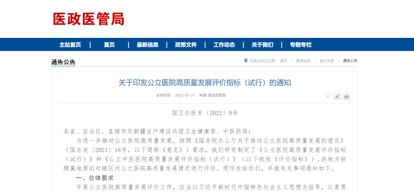 围绕着《公立医院高质量发展的意见》要求,今年7月,国家卫健委发布了《公立医院高质量发展评价指标(试行)》,从专科能力、医疗质量、医疗效率等方向,为医院全面落实高质量发展提出核心要求。