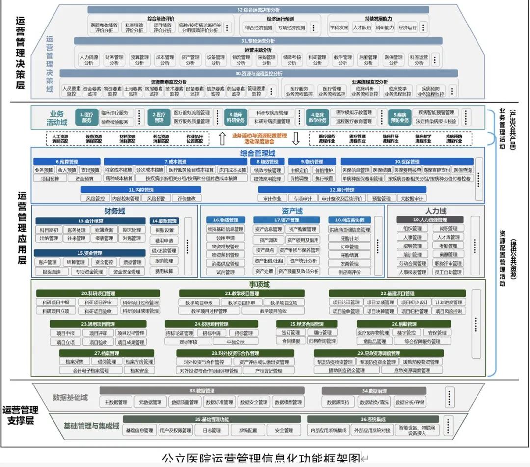 公立医院运营信息化功能框架图大篇幅展示了综合管理域、财务域、资产域、人力域、事项域的功能模块,是对《关于加强公立医院运营管理的指导意见》(国卫财务发〔2020〕27号)(下称《意见》)文件中“明确运营管理重点任务”的信息化落地。