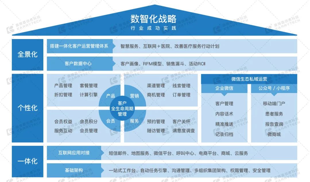医疗服务能力不断提升意味着每一个患者都能得到高品质的医疗服务,也能潜移默化地提高医院的综合竞争力。为了助力医院达成这一理想,康博嘉智慧医院整体解决方案围绕以客户体验为中心,打通院前中后营销、沟通、服务、数据全链路,帮助医疗机构实现差异化特色的医疗服务与高效运转的运营体系。借助互联网平台,让医疗机构提供 “主动式”服务模式,通过预约挂号、企业微信服务、商城服务、随访满意度管理等手段,为患者提供全链条诊疗服务。