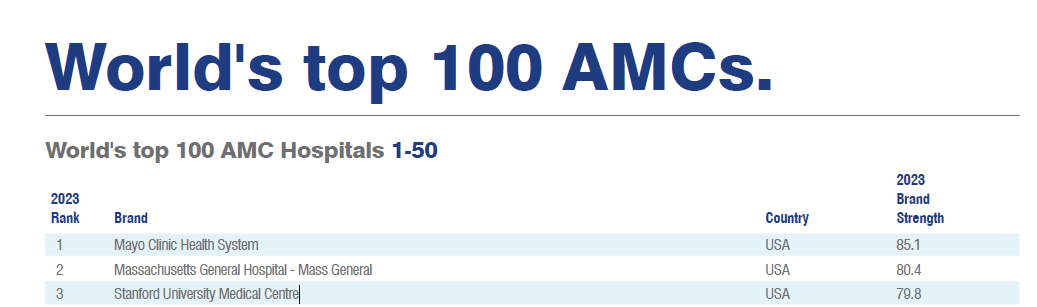 近日,国际权威品牌价值评估机构"品牌金融" Brand Finance发布《2023年全球医院250强》榜单,其中美国梅奥诊所、麻省总医院和斯坦福大学医学中心排名前三。