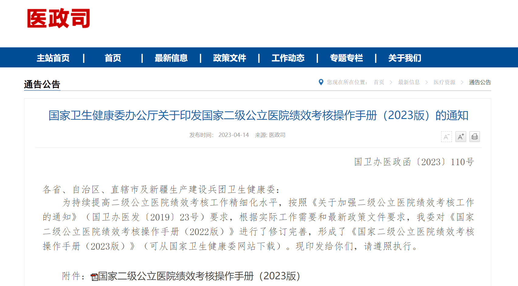 4月14日,国家卫健委印发《国家二级公立医院绩效考核操作手册(2023版)》。此版手册相较于2022版操作手册,共计修订了15个指标,其中包括补充和更新相关工作要求,以及进一步明确指标内涵。