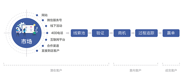 通常情况下,有健康需求的客户通过医疗机构的官网、服务热线、微信公众号、互联网平台、线上及线下市场活动及直接到店等形式,经过创建线索、清洗查重、验证虚实成为潜在客户;再经过商机需求分析、人员合理分配、销售过程追踪成为意向客户;销售通过客户画像了解客户需求喜好,经济能力等,提供有针对性的分级服务,最终有可能转化为成交客户。