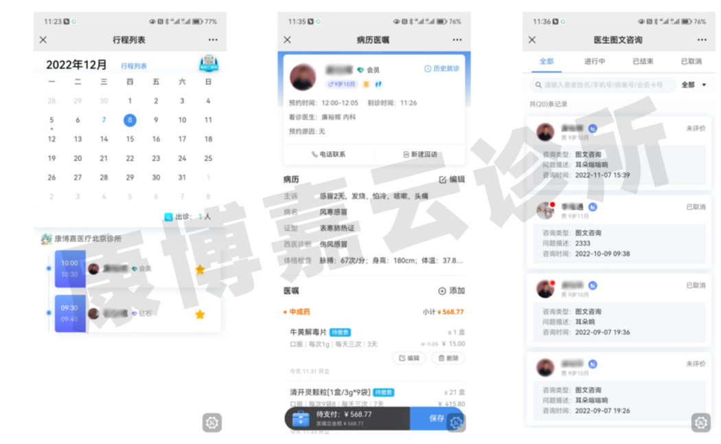 云诊所移动办公平台能够满足医生不在诊所看诊的需求。只需要一部手机,就能高质量快速完成书写病历、开立医嘱、回复图文咨询消息等日常工作,而且相关的质量控制和工具都与电脑端一致。同时,通过移动看诊模块,医生还可以随时查看自己的行程安排、管理患者并查看患者全面的健康信息。