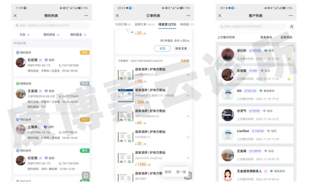 云诊所移动办公平台支持移动客服功能,诊所客服可以通过手机随时随地跟进订单处理、预约服务等日常工作,避免业务积压,让工作更便捷,服务也更及时。同时,移动客服中的客户管理功能可以帮助客服查看不同客户的详细情况,提高业务处理效率。