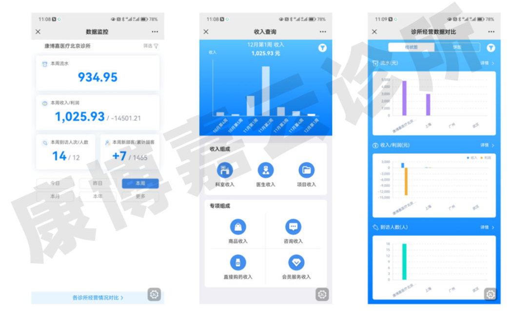 云诊所移动办公平台可以帮助诊所管理者随时随地监控到诊所经营情况。管理者可以在移动端上查看每日经营数据,通过收入、流水、就诊数量、新患者数量等关键经营指标和明细分析,掌握诊所经营情况并及时发现问题;对于连锁诊所,管理者还能横向对比各个分店相同指标的达成情况。除此之外,管理者还可以订阅经营数据消息,定期收到诊所经营报告,让管理变得更轻松。