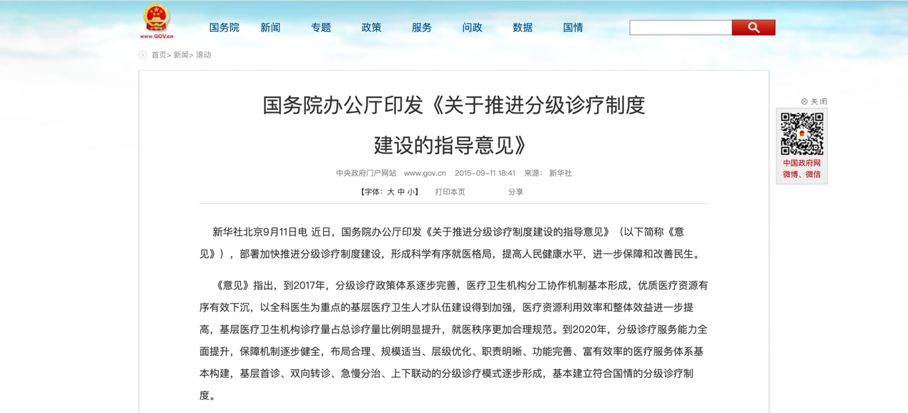 2015 年 9 月 8 日,国务院办公厅发布了《关于推进分级诊疗制度建设的指导意见》,明确了对构建“基层首诊、双向转诊、急慢分治、上下联动”的分级诊疗制度的大力支持。面对全国范围内对分级诊疗的需求缺口,社会办医尤应寻求差异化发展,发掘医疗市场潜能。