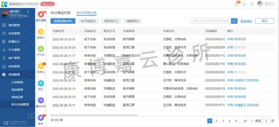 康博嘉云诊所还提供专有页面协助诊所管理积分产品订单,诊所客服可以通过兑换记录查看兑换时间、兑换商品名称、配送方式及兑换状态。如客户选择的是实物商品,可支持快递或到店自提服务;如客户选择兑换医疗服务、优惠券或赠送金,则可以到店核销或线上使用。