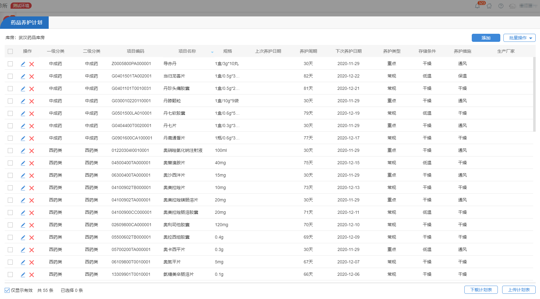 门诊管理系统康博嘉云诊所通过【药品养护计划】帮助诊所记录库房中每个品类的养护类型(重点、常规)、养护周期、养护方法。系统还会智能计算每个品类的下次养护日期,自动推送养护提醒,杜绝在之前药品养护工作中容易出现的遗漏情况。