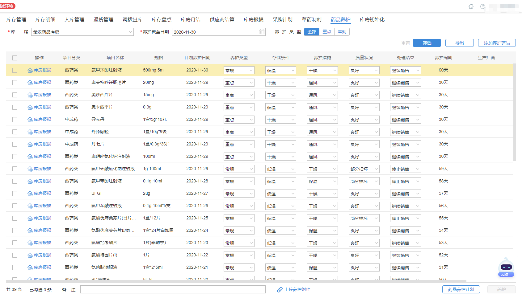 完成药品养护后,可在【质量状况】、【处理结果】中记录相关情况信息。养护过程中,发现药品的已经因为变质、过期等原因无法继续销售,则可进行【报损】操作。