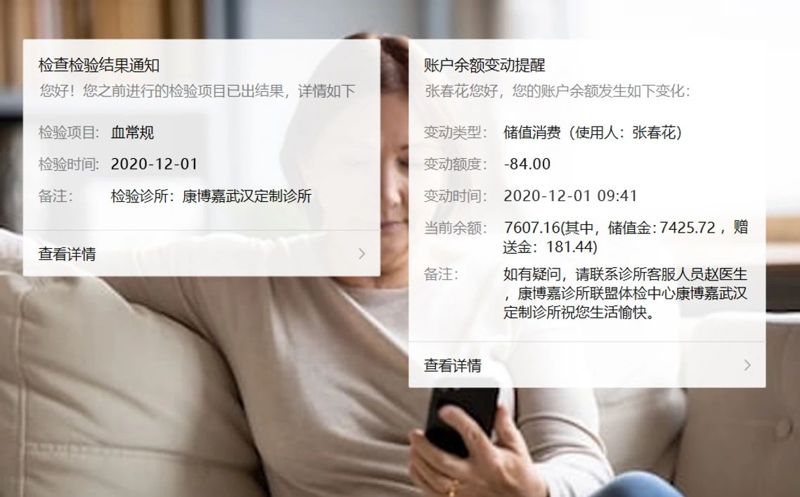 每一次在诊所产生消费后,张大妈都会收到消费提醒,每一笔花费都明明白白。用张大妈的话来说就是“看病看得顺心,花钱花得踏实!”
