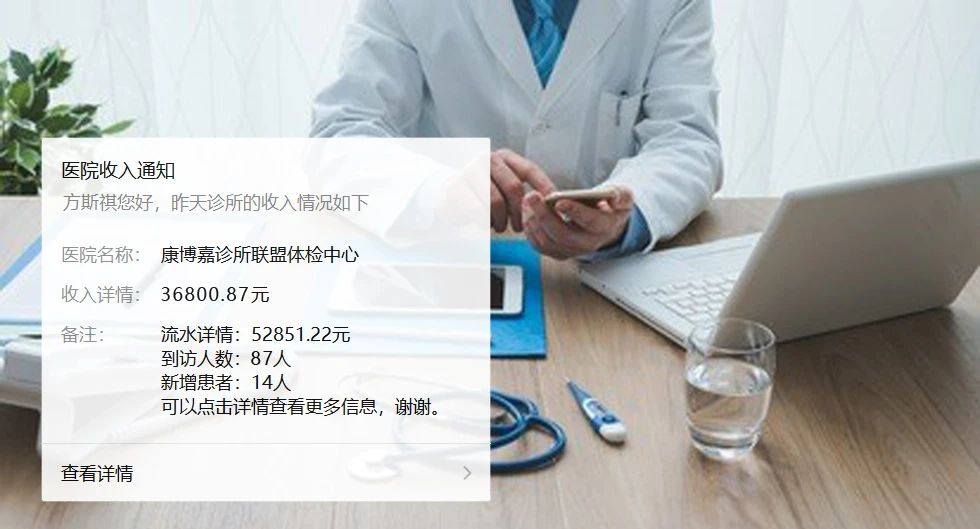 每天上午9点,诊所管理者会收到诊所管理软件发布的诊所前一天的收入通知,包括流水情况、到访人数、新增患者三大核心指标,让管理者心中有“数”。
