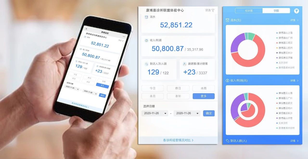 管理者点击“查看详情”,可查看数据简报。连锁诊所管理者还能通过可视化数据分析表来比较不同诊所之间的核心数据差异。