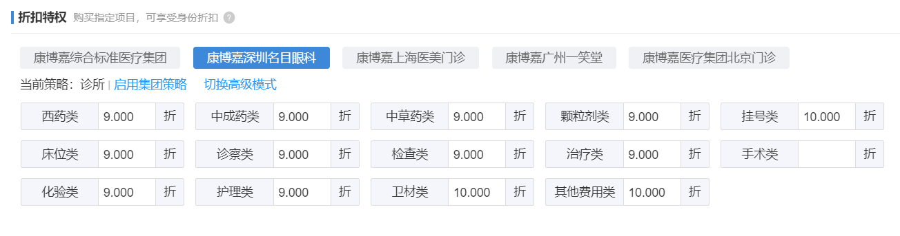 康博嘉云诊所的医疗软件平台上,可以对每个等级的会员设置不同的折扣特权内容,哪些项目没折扣,哪些项目有折扣,有多少折扣都可以精准设定。同时,对于集团化诊所可设置集团策略,兼顾统一管理和个性化设置。