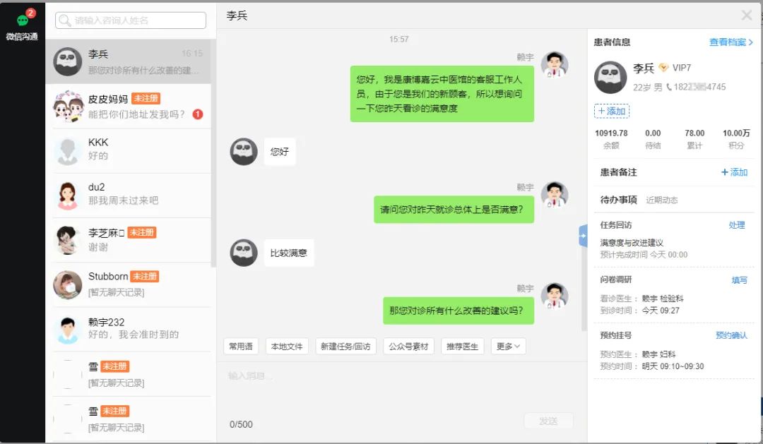 5. 新建任务回访:可对顾客进行诊后回访和满意度调查,增强沟通反馈机制;
