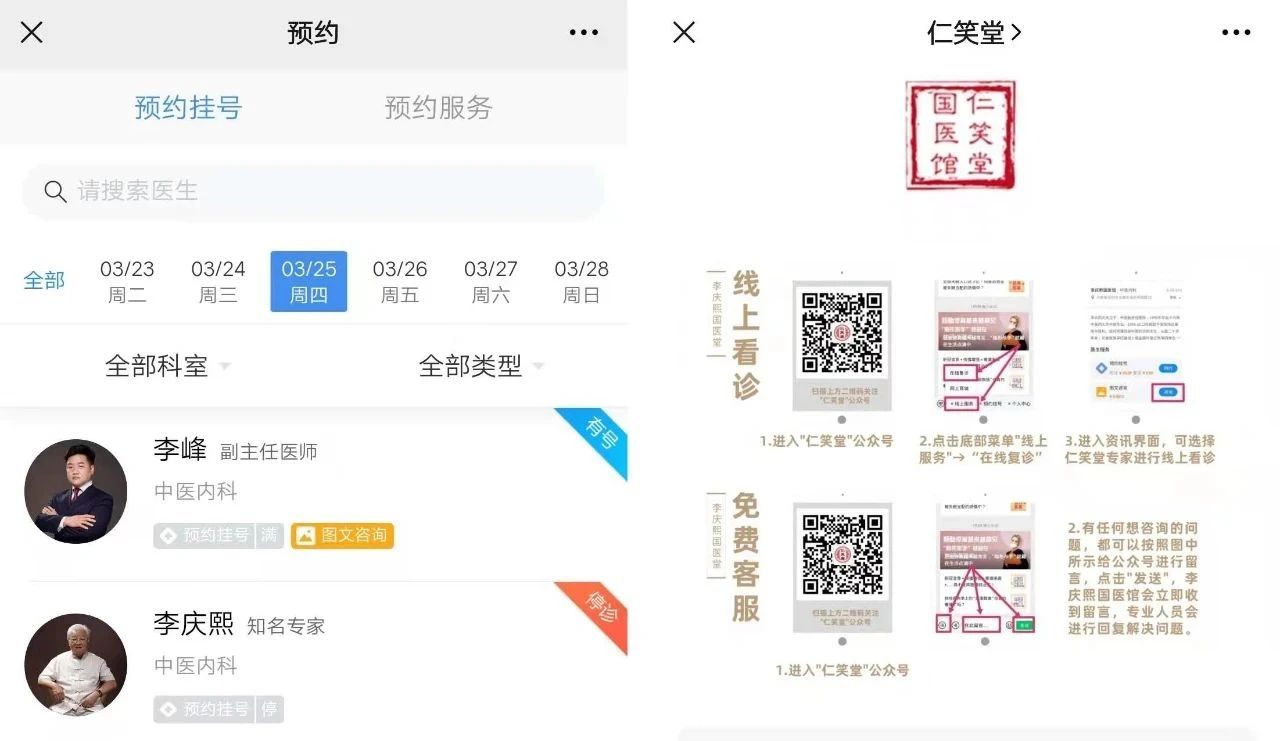 仁笑堂李庆熙国医馆不仅在微信公众号上开设了“在线复诊”“网上商城”“一键咨询”和“预约挂号”等新医疗业务模式入口,2021年春节过后,还专门把“线上看诊”和“微信咨询”的入口及操作方法放到公众号每篇文章的开篇位置。
