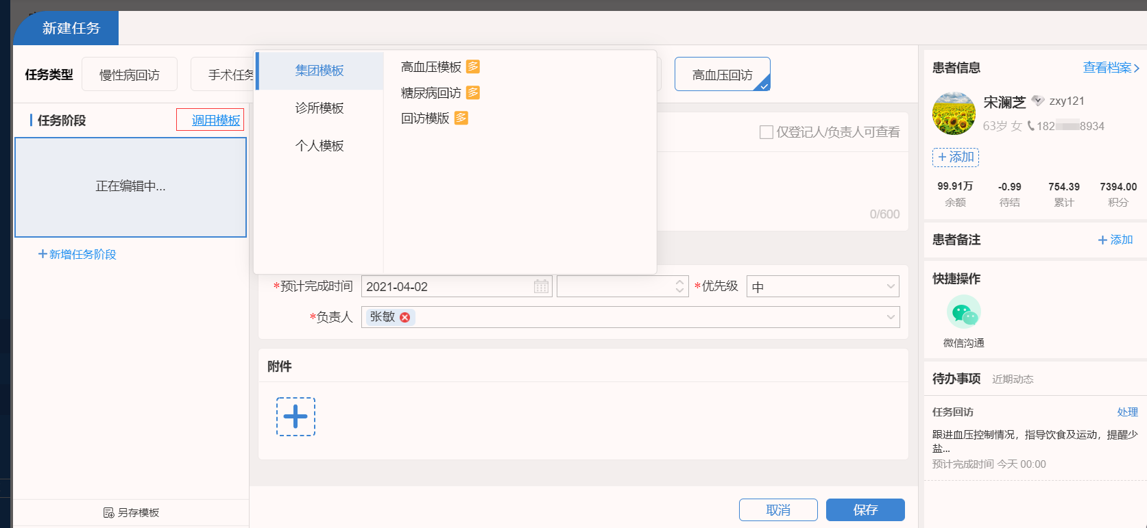 张医生为其测血压后,开立了一些药物,并且叮嘱宋大妈平时饮食需要低盐低脂,多运动。同时,张医生为宋大妈新建了慢病回访,直接调用了高血压的回访模板,定期跟踪病情,进行指导。