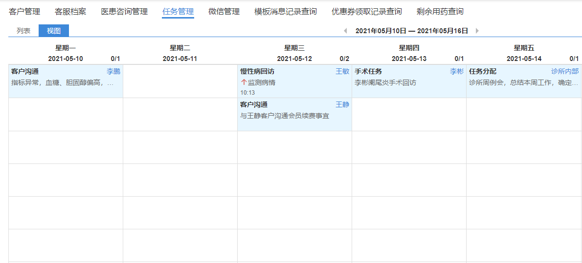 于是,张医生在诊所管理软件中新建任务【客户沟通】,把李先生“五一假后安排做全面体检”的意向记录下来,准备在5月10号跟进李先生的检查安排。新建任务后,该事项在【任务视图】中一目了然,张医生只用提醒客服适时与李先生沟通即可。