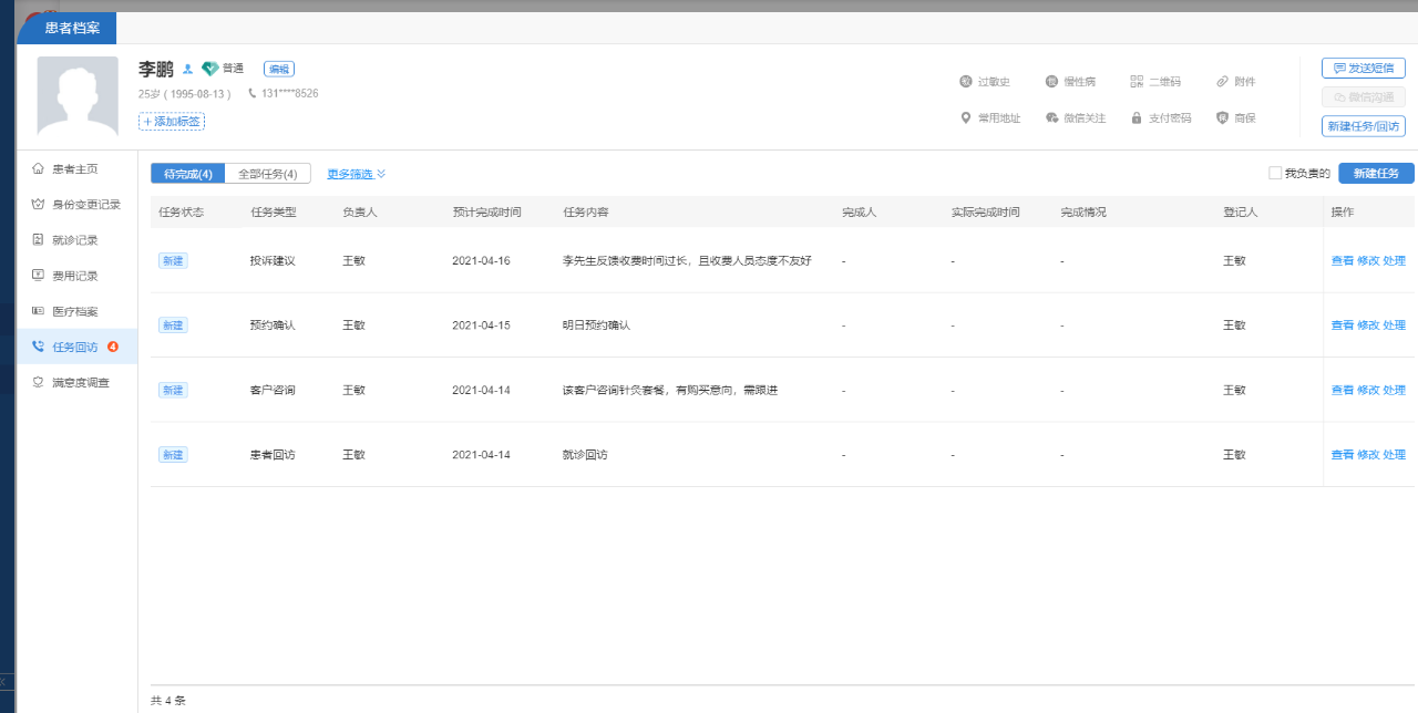 医馆可以在诊所管理软件中开启进行自动回访,设置好对应的任务类型、任务内容、负责人后,会对每一位在医馆享受完服务的顾客自动建立一个回访,并督促相关负责人有条理地跟进。