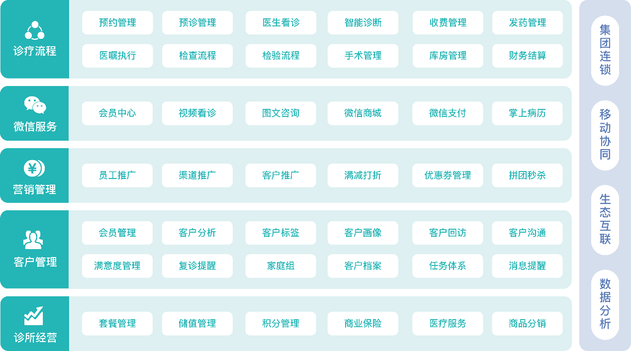 当然,梅奥发展到现在也离不开一个流程完备的信息化工具。我们的诊所管理系统,集国内外医疗信息化发展之大成,包括诊疗流程、诊所经营、客户管理、营销管理、微信服务等五大基础版块,和集团连锁、移动协同、生态互联、数据分析四大进阶版块,能够帮助诊所高效处理业务的同时,打造属于自己的品牌力。