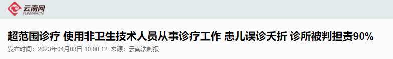 近期,云南网发布了一篇报道,一家诊所因为让非卫生技术人员进行诊疗,导致一儿童夭折。诊所被判负90%的责任,共计赔偿90多万元。